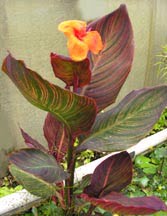 Variegated Canna Plant, Also referred to as Bengal Tiger Canna, this Variegata Canna is a beautiful 3′ to 4’+ tall plant with green leaves with yellow stripes. The orange flowers peer high above on a tall stalk. Because of it’s height, you will see it’s deep orange-red flowers from afar. Your neighbors will envy you when they see your cannas. Better yet, you can bring it indoors in winter to brighten up your room.