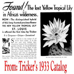 Prior to 1933 there were no yellow flowered tropical hybrid water lilies offered. In 1890 a yellow flowered water lily was discovered in a remote part of Africa but lost.